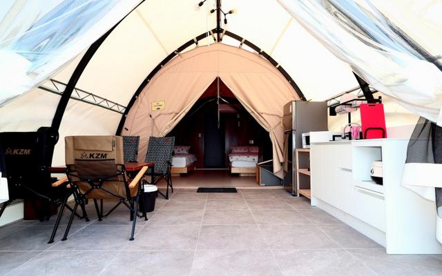 아름다운 자연 경관과 함께 편안한 휴식을 즐길 수 있는 합천 글램핑장으로 침실, 거실, 주방, 욕실 등이 있으며, 각 객실마다 개별 테라스가 있어 여유로운 분위기를 느낄 수 있습니다.