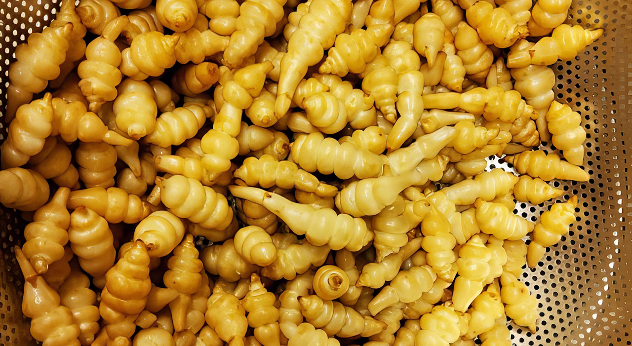 초석잠은 한국, 중국, 일본 등 동아시아 지역에서 오랫동안 재배되어온 다년생 식물입니다. 그 독특한 모양 때문에 '중국 죽순' 또는 '일본 죽순'이라고도 불리며, 학명인 Stachys sieboldii는 19세기 독일의 의사이자 식물학자인 필립 프란츠 폰 시볼트의 이름을 따서 지어졌습니다. 초석잠의 뿌리는 마디마디 연결된 형태로, 마치 작은 애벌레나 유충을 연상시키는 모양을 하고 있어 '애벌레 뿌리'라는 별명도 가지고 있습니다. 이러한 특이한 외형은 초석잠을 다른 식물들과 쉽게 구별할 수 있게 해주는 특징입니다.